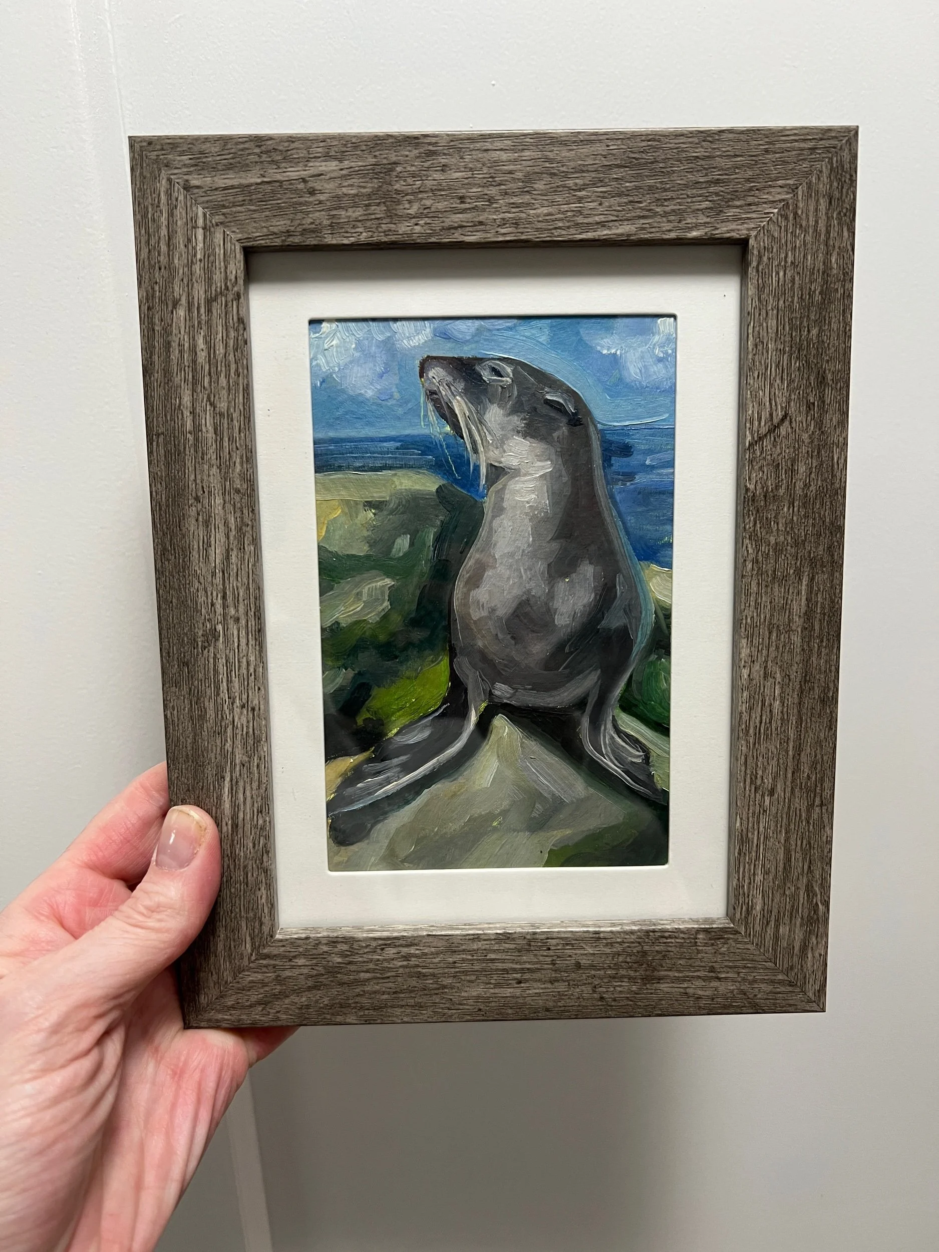 Shop Originals › Sea Lion Study Oil on Paper Image 1 of 2 Image 2 of 2 Sea Lion Study Oil on Paper CA$85.00 Get notified by email when this product is in stock. Add To Cart Added! A majestic sea lion. 4x6 oil painting on a 6x9 paper framed and matted. A majestic sea lion. 4x6 oil painting on a 6x9 paper framed and matted.